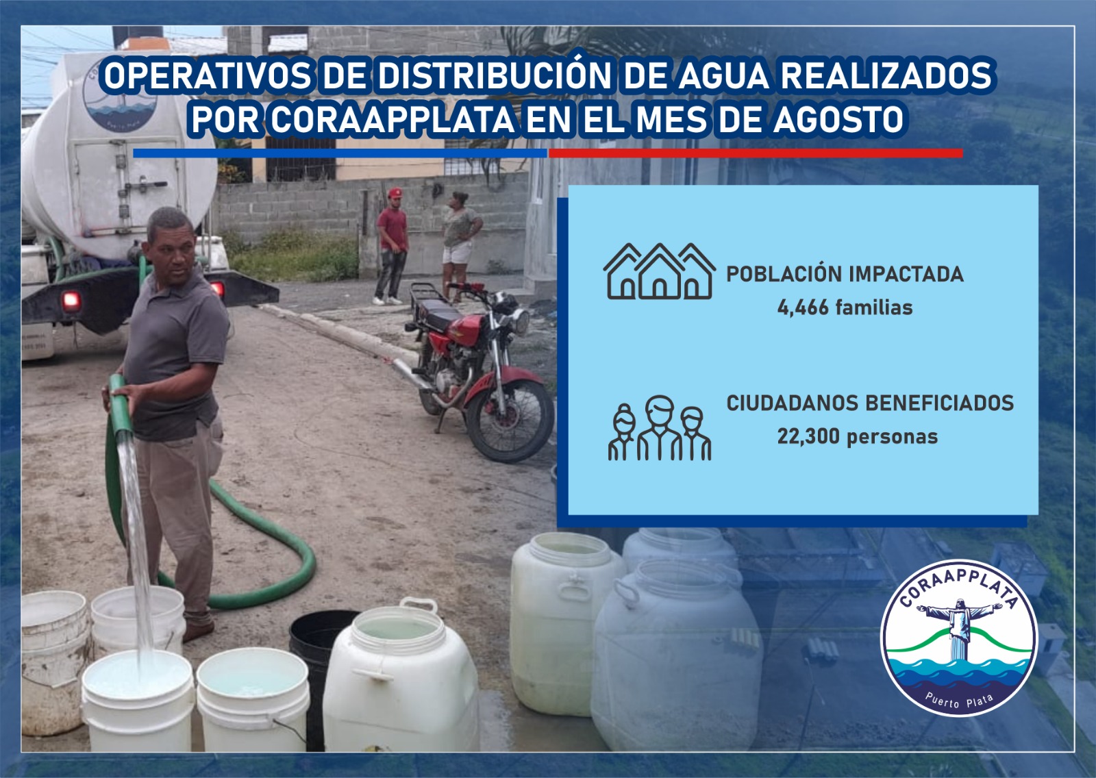 PUERTO PLATA. – Un total de 4, 466 familias fueron beneficiadas el pasado mes de agosto con los operativos de distribución de agua a través de los camiones cisterna de la Corporación de Acueductos y Alcantarillados de Puerto Plata (CORAAPPLATA) llevados a cabo en toda la provincia Puerto Plata.